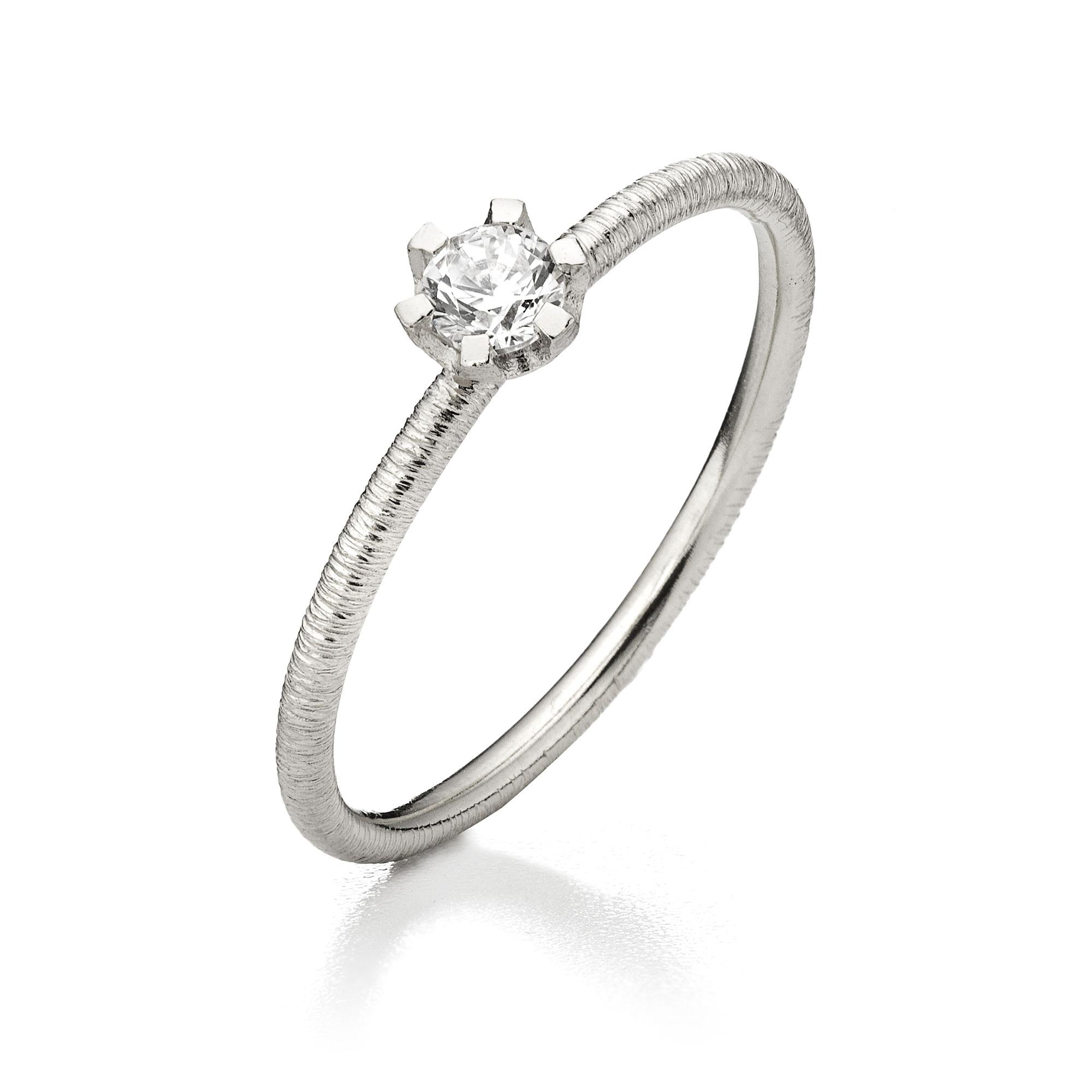 Love and romance find expression in the Scarlett solitaire ring. With a white, cognac or champagne-colored diamond, it sparkles proudly and confidently. He appears strong and independent like Scarlett O‘Hara, the namesake and main character from the classic film “Gone with the Wind”. The diamond ring stands for love – as a proposal ring or as an appreciation for yourself. The fine, silky yarn structure of the ring band gives the ring a special look. The powerful claw setting with the diamond shines like a little sun and can be easily combined with a marriage or eternity ring without creating a gap.