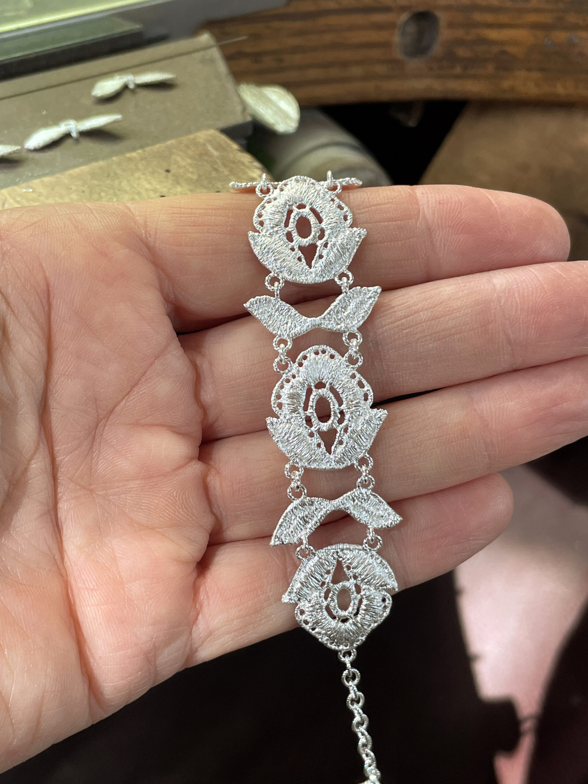 Die filigranen Ornamente erinnern an Rosenblätter, vom Licht gestreichelt. Ihre feine Struktur zeigt sich erst auf den zweiten Blick – oder wenn Du sie berührst. Dieses zarte Spiel zwischen Stärke und Sanftheit macht Wild Rose so besonders.