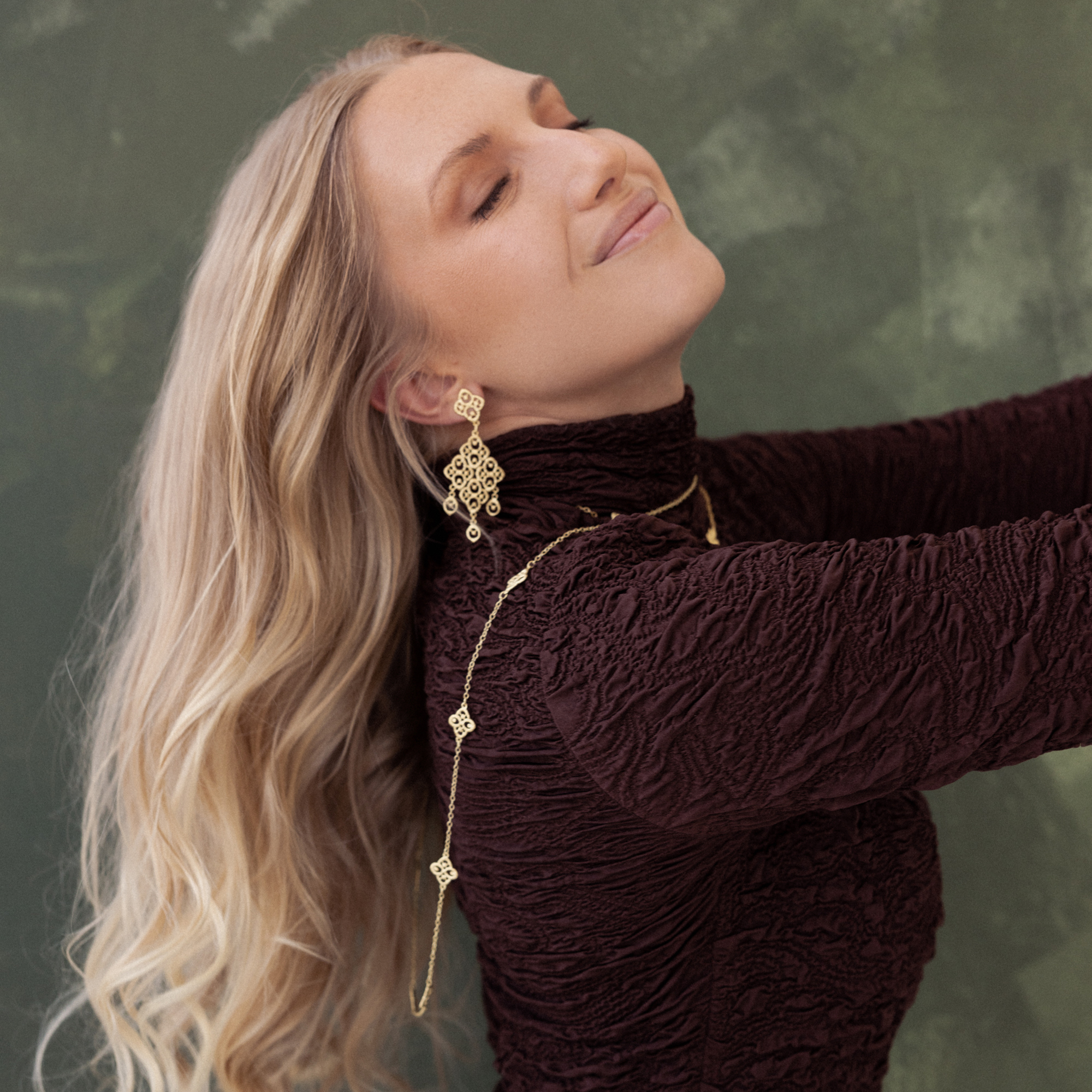 Wie eine sanfte Sommerbrise umschmeichelt lange Halskette „Chiara“ das Handgelenk. Unbeschwert und edel, beeindruckt sie durch filigrane Ornamentik. Das Schmuckstück im Geiste italienischer Eleganz und Leichtigkeit vereint den verspielten Charme der gotischen Architektur mit dem Zauber zarter Spitzenstrukturen, die nicht nur in den ornamentalen Elementen, sondern auch in den einzelnen zarten Kettengliedern zum Ausdruck kommt. Die gekonnte Verbindung von Lässigkeit und Eleganz, umgesetzt in bester Goldschmiedekunst, macht die Kette zu einem unverzichtbaren