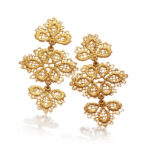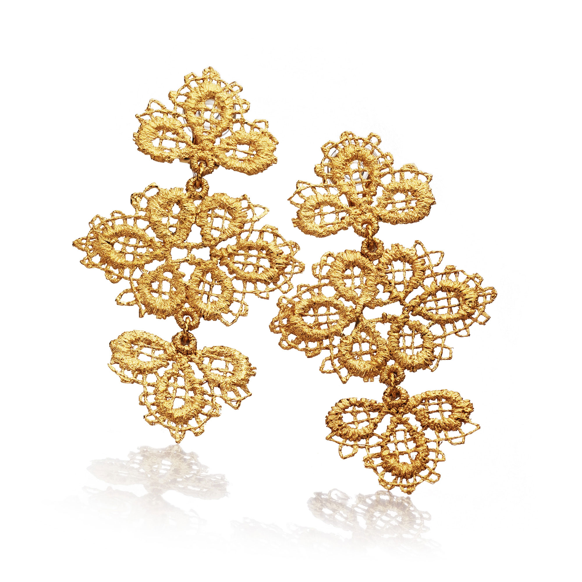 Das Gemälde einer Kaufmannstochter mit großzügigem Spitzenkragen hat Brigitte Adolph zu den Ohrhängern Merchants Daughter inspiriert. Die mehrgliedrige Opulenz dieses Schmuckstücks spielt mit der Illusion zarter Spitze. Die Gesamtlänge der Ohrringe beträgt 7,2 cm.